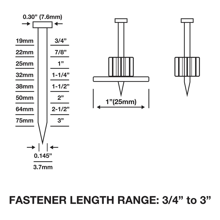 Firing into green concrete (concrete poured less than 25 days prior) will provide the best results when driving longer pins. This durable and lightweight air powered nail gun is built to last and features an ergonomic body, a comfort grip handle, and 360 degree adjustable exhaust.