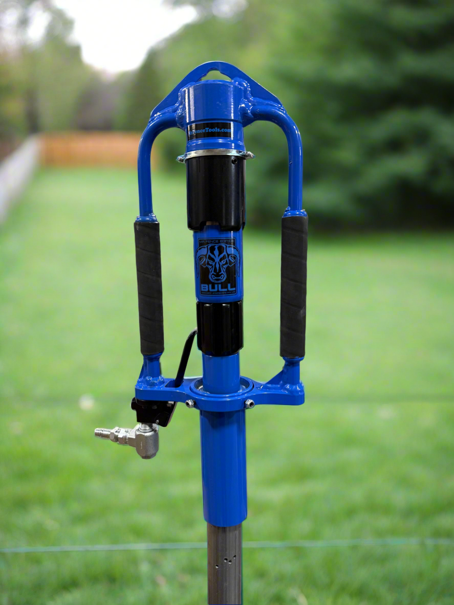 One great thing about The BULL is unlike its competitors, it needs virtually no maintenance. Due to the fact there are no seals, gaskets or “O” rings inside the Driver, there is nothing to maintain. A simple, quick shot of WD-40 into the air valve below the handle (after every 2-3 hours of use) will dissipate any possible moisture in the cylinder caused by the compressed air. You can run several hundred feet of 1/2" hose around to the backyard and leave the Compressor on the truck or trailer. Compressor needs at least a 38CFM, we recommend the PUMA on our site. Available in 10 Gallon Portable and 30 Gallon (Mounted) Options.